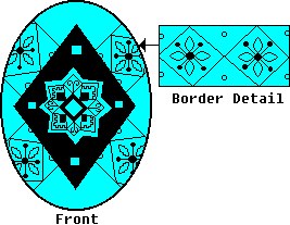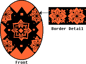 Use the medium kistka. When you have double-checked your lines, dip the egg in the Orange dye. You may wish to dip it in the Orange wash first, to rinse off the blue dye. (If you use the wash, leave it in about 10 minutes, then dip it in the Orange dye). Leave it in about 15 minutes, or until the desired shade is reached. Then gently remove it, and dab it dry. |