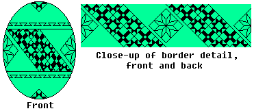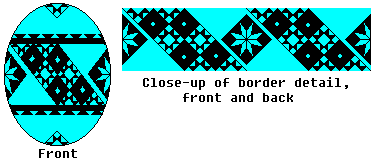 Use the medium or heavy kistka. When you have double-checked your lines, dip the egg in the Orange dye. You may wish to dip it in the Orange wash first, to rinse off the blue dye. (If you use the wash, leave it in about 10 minutes, then dip it in the Orange dye). Leave it in about 15 minutes, or until the desired shade is reached. Then gently remove it, and dab it dry. |