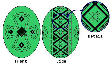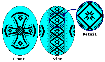 Use the heavy kistka. When you have double-checked your lines, dip the egg in the Orange dye. You may want to dip it in the Orange wash first, to rinse off the blue dye. (If you use the wash, leave it in about 10 minutes, then remove it, dab it dry, then dip it in the Orange dye). Leave it in about 15 minutes, or until the desired shade is reached. Then gently remove it, and dab it dry. |