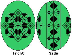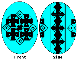 Use the fine and medium kistkas. When you have double-checked your lines, dip the egg in the Orange dye. You may want to dip it in the Orange wash first, to rinse off the blue dye. (If you use the wash, leave it in about 10 minutes, then remove it, dab it dry, then dip it in the Orange dye). Leave it in about 15 minutes, or until the desired shade is reached. Then gently remove it, and dab it dry. |