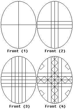 Front (1): Divide the egg into eighths, as shown. Front (2): Draw 2 parallel lines to the horizontal and vertical lines, as shown. Front (3): Draw 2 more parallel lines to the horizontal and vertical lines, of equal width, as shown. Front (4): Draw diamonds, of equal size, using the previously drawn lines as width guides, as shown. Finally, draw one diamond (the same size as the others in the design) in the center of the eight clear areas, as shown. When you have drawn all the lines in pencil that you wish to, go ahead to White. |