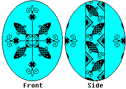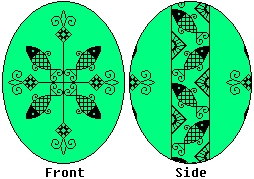 kistka, on both sides of the egg. When you have double-checked your lines, dip the egg in the Orange dye. You may want to dip it in the Orange wash first, to rinse off the blue dye. (If you use the wash, leave it in about 10 minutes, then remove it, dab it dry, then dip it in the Orange dye). Leave it in about 15 minutes, or until the desired shade is reached. Then gently remove it, and dab it dry. |