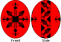 kistka, on both sides of the egg. When you have double-checked your lines, dip the egg in the Bright Red dye. Leave it in about 15 minutes, or until the desired shade is reached (REMEMBER: NO LONGER THAN 45 MINUTES!). Then gently remove it, and dab it dry. |