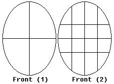 Front (1): Divide the egg into eighths, as shown. Front (2): Draw two parallel lines to the vertical and horizontal lines, as shown, on all four sides of the egg. |