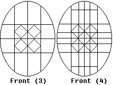 Front (3): Draw four diamonds in the centre squares. Front (4): Draw two additional parallel lines to the vertical and horizontal lines, slightly less than half way between the previous lines, as shown. All four sides of the egg should look identical at this point. When you have drawn all the lines in pencil that you wish to, go ahead to White. |