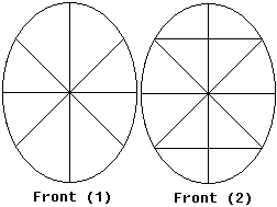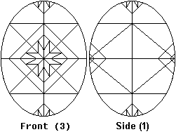 so it won't show up in the final design. Front (1). First, you must divide the egg into sixteenths. You draw a line around the length of the egg, then another line at a right angle to it. Then you repeat the process at a 45 degree angle to the lines already there. Next, draw a line around the middle. Now the egg is divided into sixteenths. Front (2). Draw two horizontal lines, parallel to the main dividing horizontal line. |