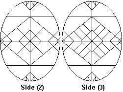 Side (3). Draw lines parallel to the diagonal dividing lines, as shown. When you have completed this, dip the egg in the Yellow dye. Leave it in for about 15 minutes, or until the desired shade is reached (REMEMBER, NO LONGER THAN 45 MINUTES!). Then remove the egg, and dab it dry. |