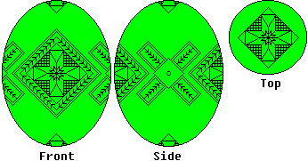 Use the fine kistka. When you have double-checked your lines, dip the egg in the Light Green dye. Leave it in about 15 minutes, or until the desired shade is reached. Then gently remove it, and dab it dry. |