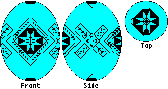 Use the heavy kistka. When you have double-checked your lines, dip the egg in the Orange dye (or in the Orange Wash--leave the egg in the wash about 10 minutes, then dip it in the Orange dye). Leave it in about 15 minutes, or until the desired shade is reached. Then gently remove it, and dab it dry. |