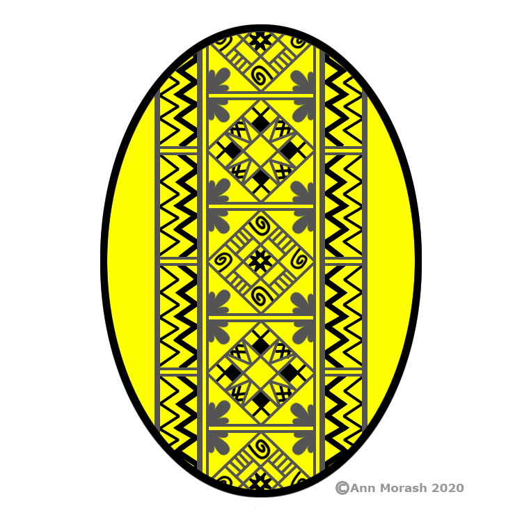 ![]() Draw these lines on the egg using the fine & heavy kistky, on both sides of the egg. The lines that were already applied for white are in grey, the new lines to apply for yellow are in black. When you have double-checked your lines, dip the egg in the Orange dye. Leave it in about 15 minutes, or until the desired shade is reached. Then gently remove it, and dab it dry. |