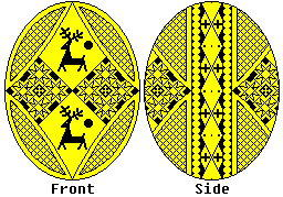 When you have double-checked your lines, dip the egg in the Yellow dye. Leave it in about 15 minutes, or until the desired shade is reached (REMEMBER: NO LONGER THAN 45 MINUTES!). Then gently remove it, and dab it dry. |