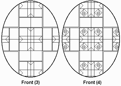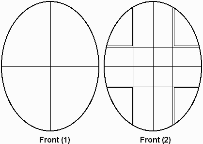 Front (1): Divide the egg into eighths, as shown. Front (2): Draw the two lines parallel to the main horizontal and vertical dividing lines. Draw the additional lines close together, as shown. |