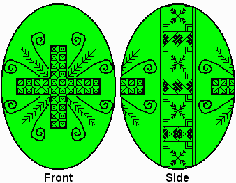 When you have double-checked your lines, dip the egg in the Orange dye. You may want to dip it in the Orange wash first, to rinse off the blue dye. (If you use the wash, leave it in about 10 minutes, then remove it, dab it dry, then dip it in the Orange dye). Leave it in about 15 minutes, or until the desired shade is reached. Then gently remove it, and dab it dry. |
