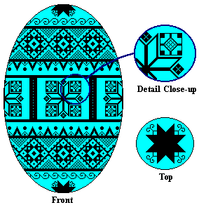 Use the medium kistka. When you have double-checked your lines, dip the egg in the Light Blue dye. Leave it in about 15 minutes, or until the desired shade is reached. Then gently remove it, and dab it dry. |