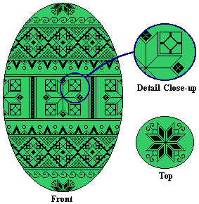 Use the medium kistka. When you have double-checked your lines, dip the egg in the Orange dye. You may want to dip it in the Orange wash first, to rinse off the blue dye. (If you use the wash, leave it in about 10 minutes, then remove it, dab it dry, then dip it in the Orange dye). Leave it in about 15 minutes, or until the desired shade is reached. Then gently remove it, and dab it dry. |